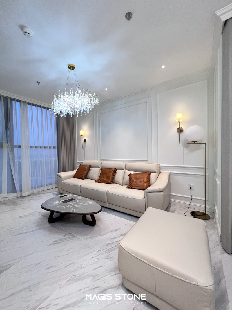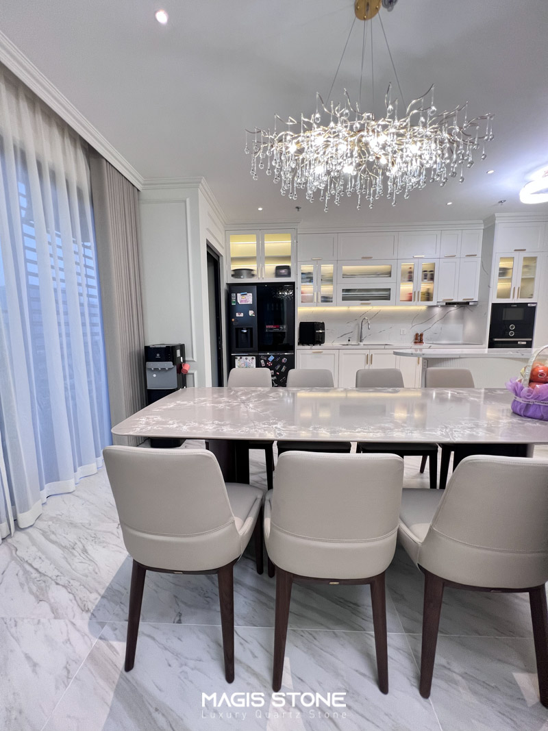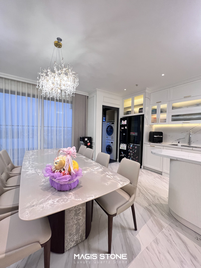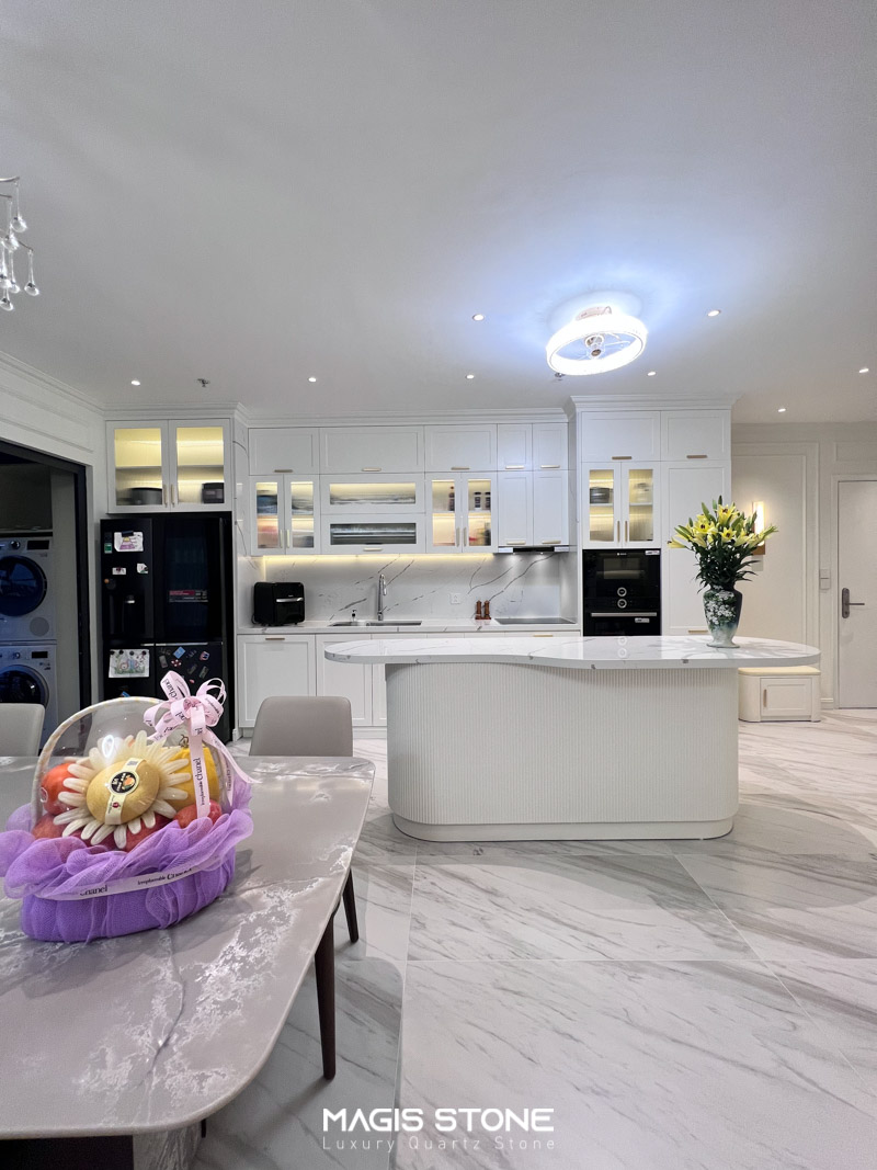 Chúng tôi rất hân hạnh được đồng hành cùng gia đình tại Vinhomes Ocean Park 1 trong việc kiến tạo nên không gian bếp đẳng cấp và tinh tế. Với sự kết hợp hoàn hảo giữa MG8410 Calacatta Prestige cho bàn bếp, tường bếp và MG9880 Ice White cho mặt bàn ăn , Magis Stone đã mang đến một không gian sống sang trọng, tiện nghi và đầy cảm hứng.