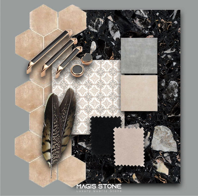 Trên nền đen tuyền sâu thẳm và huyền bí, những mảng marble màu trắng xám, ánh vàng và đồng loang tạo nên một kết cấu thị giác mạnh mẽ. Không tuân theo trật tự, không bị đóng khung, mỗi vệt đá là một dấu ấn riêng, một chuyển động ngầm của tự nhiên được gìn giữ và tái sinh trong chất liệu nhân tạo hiện đại.